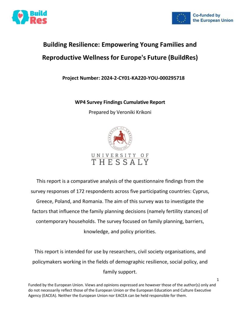 This cumulative report presents the results of a questionnaire conducted across five participating countries and reaching 172 respondents from Cyprus, Greece, Romania, France and Poland.  It is a synthesis of all the national survey findings to identify shared barriers to family formation, widespread fertility misconceptions, and policy priorities. The analysis highlights both common European challenges and country-specific distinctions, providing the evidence base for the development of a practical training curriculum for Youth Workers under the BuildRes project.